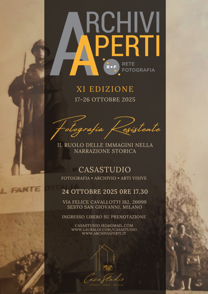 L’idea che un’abitazione possa aprire le sue porte al pubblico e farsi strumento di partecipazione condivisa è il collante di tutto il progetto, che vuole sempre e comunque riallacciarsi e rimanere saldamente legato alla dimensione familiare e dunque alla casa per antonomasia. Casa è indissolubilmente famiglia. Casa è anche un luogo di lavoro silenzioso, intimo. Casa è quello spazio dove i muri perimetrali ne abbattono degli altri; è uno spazio di ritrovo, accoglienza, ascolto e confronto. CasaStudio nasce, dunque, col desiderio di creare – attraverso la fotografia e lo studio dell’archivio d’immagini – incontri informali, racconti ed esperienze; una rete non solo di rapporti ma anche e soprattutto di testimonianze. Una memoria partecipata da tenere viva e tutelare. La più ampia forma di cultura: lo scambio reciproco. CasaStudio raccoglie e accoglie storie, di ciascuno e di tutti, come una casa accoglie e raccoglie le storie del singolo, della famiglia che la vive e delle persone che la frequentano. E le conserva. Conserva immagini, parole, suoni. Perché anche ogni immagine, parola o suono è una piccola, grande storia da ascoltare, curare e conservare. E tra chi ascolta e racconta, tra chi mostra e chi osserva si crea, così, inevitabilmente, un legame: s’innesca quell’ingranaggio di ricerca e scoperta (o riscoperta) di un’identità, individuale prima, collettiva poi, che trova nella fotografia la sua massima espressione.